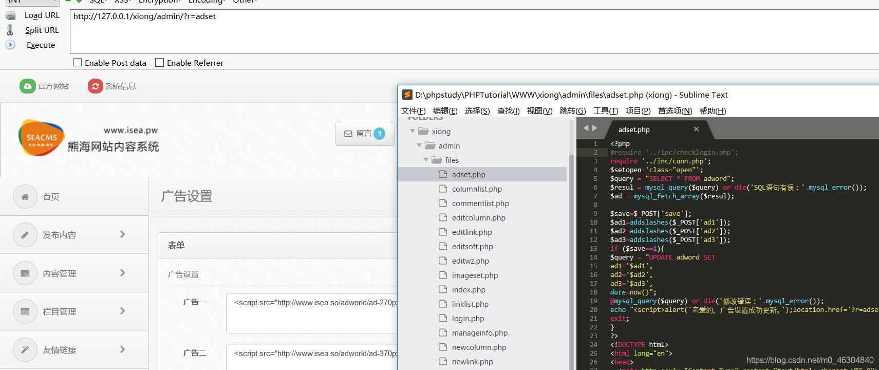 这里用到熊海CMS,我们随便点击一个后台页面,前面包含了一个验证文件require '../inc/checklogin.php'; 来看看这个文件