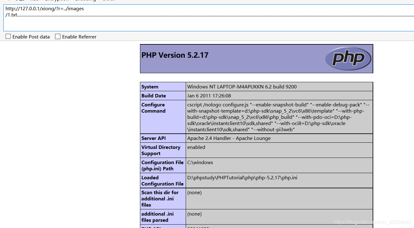 http://127.0.0.1/test.php?name=D:\phpstudy\PHPTutorial\MySQL\my.ini这是个最简单的文件包含,没有任何过滤。但是一般程序不会这么写,一般会指定后缀,这样我们就需要截断来绕过了。