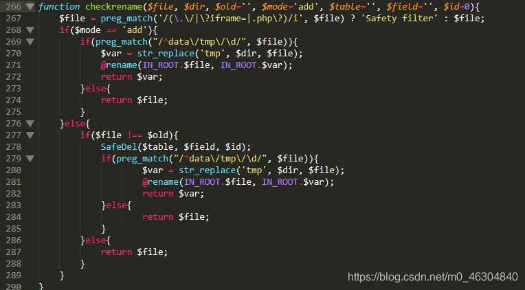 我们传入的mode是get,然后经过addslashes()的转义,下面在替换为空,也就是我们基本上是不能使用\\了,我们在看看checkrename